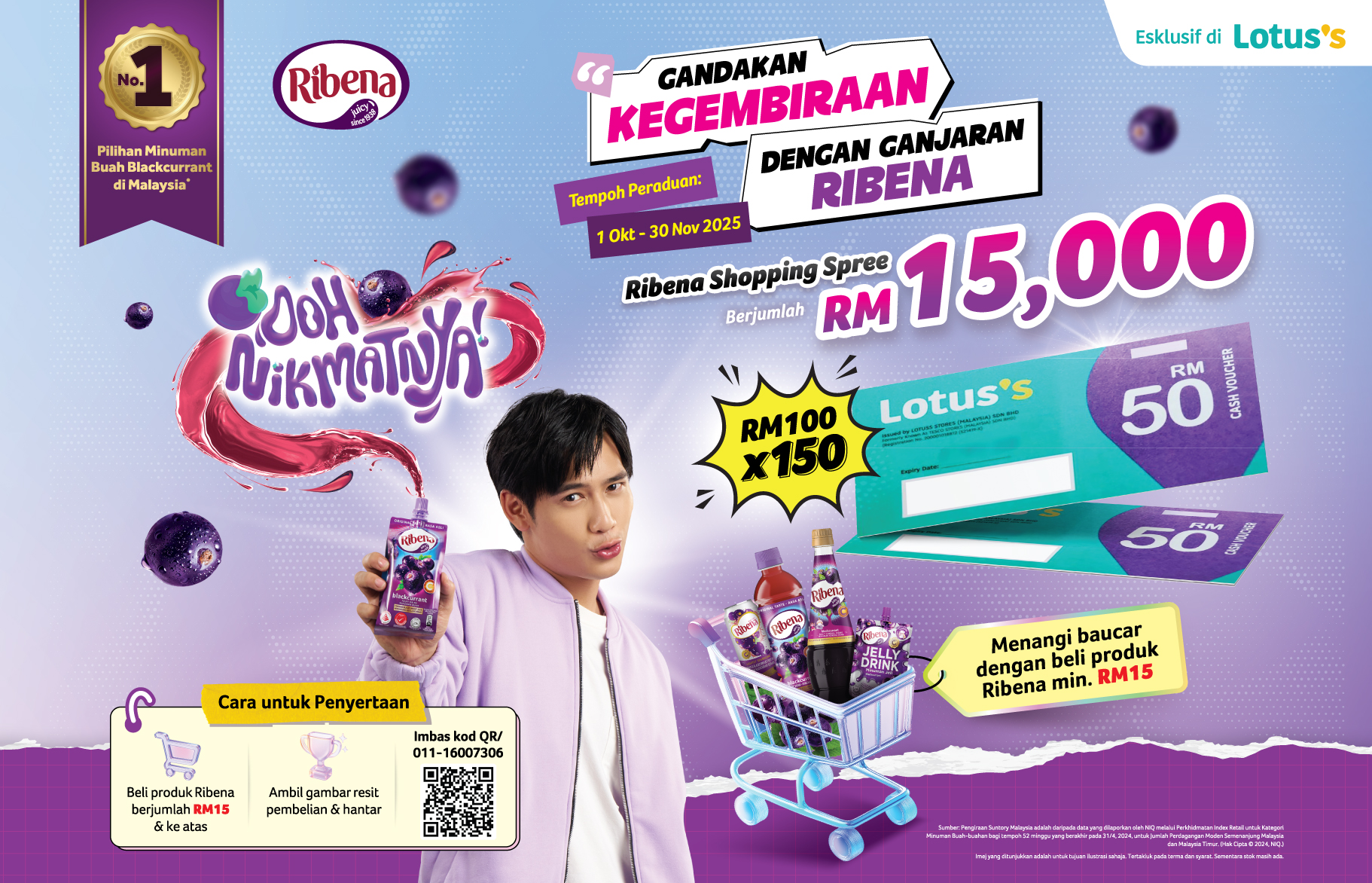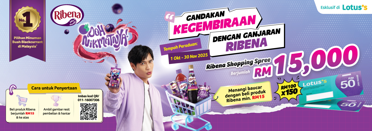 - 6. Untuk menyertai Peraduan ini, peserta perlu membeli sebarang produk Ribena di Lotus’s [“Bukti Pembelian”]. Setiap resit dengan pembelian produk Ribena bernilai RM15 dan ke atas akan diberikan satu (1) penyertaan.